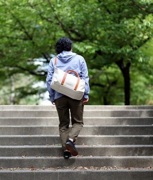 パターンに微妙な湾曲を加えることで横長の筒形に なったり、コンパクトな俵形になったりと、中に入れる荷物や持ち方によって自在に形を変えるショルダーバッグ。Wジップ仕様で両端まで大きく間口が開くので、荷物の多い出張先や小旅行などでも活躍してくれます。